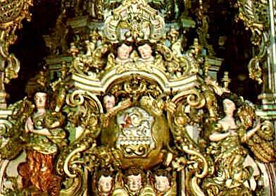Artístico sacrário completa esta magnificente obra de talha dourada que é retábulo do Altar-mor.